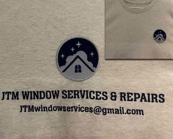 Top-quality embroidery work became the final destination of our creative journey with JTM Window Service and Repair. The logo was rendered into two distinct sizes, each tailored for a specific placement. The first, a smaller version for the front—sleek and precise. The second, an outsized rendition for the back, included contact email details.