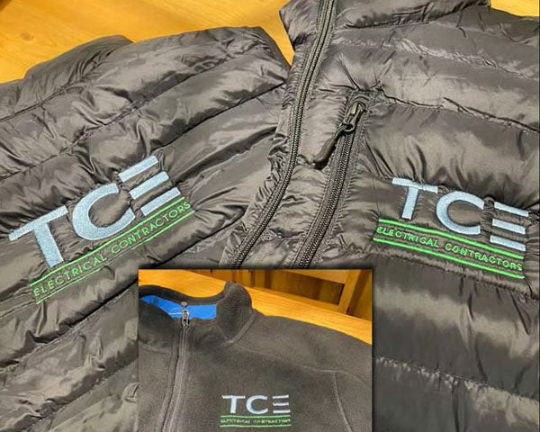 Each stitch, whether on fleece or padded textile, represented the robust values of TCE Electrical Contractors—bold, established, and hazard-proof, tailor-fit just like their precise services.